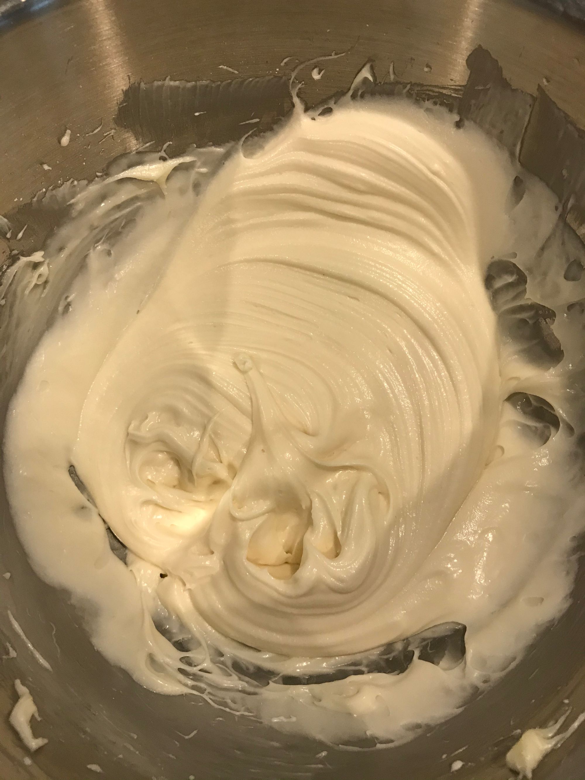 Cream cheese frosting was more challenging to replicate. In the end, a buttercream frosting was made and thinned out with some cream to keep it softer in the freezer.