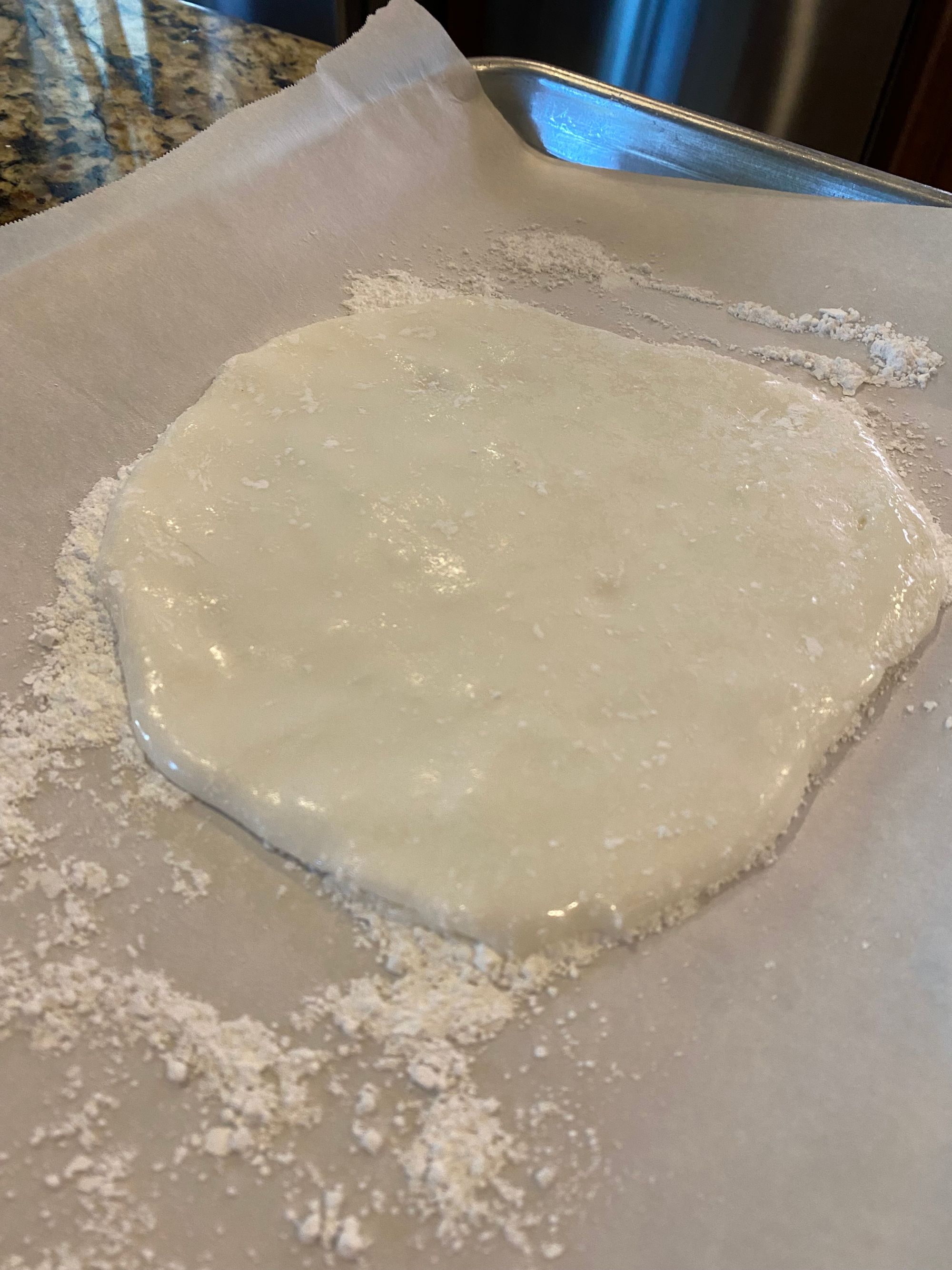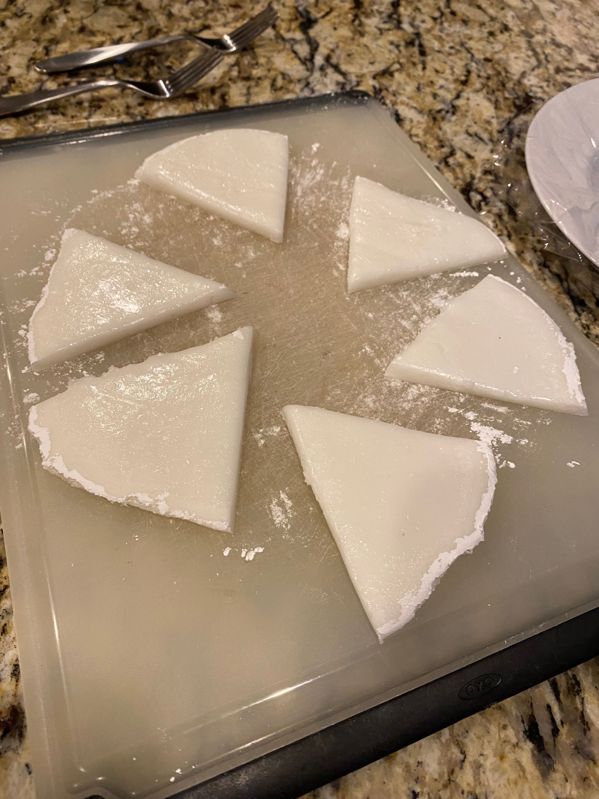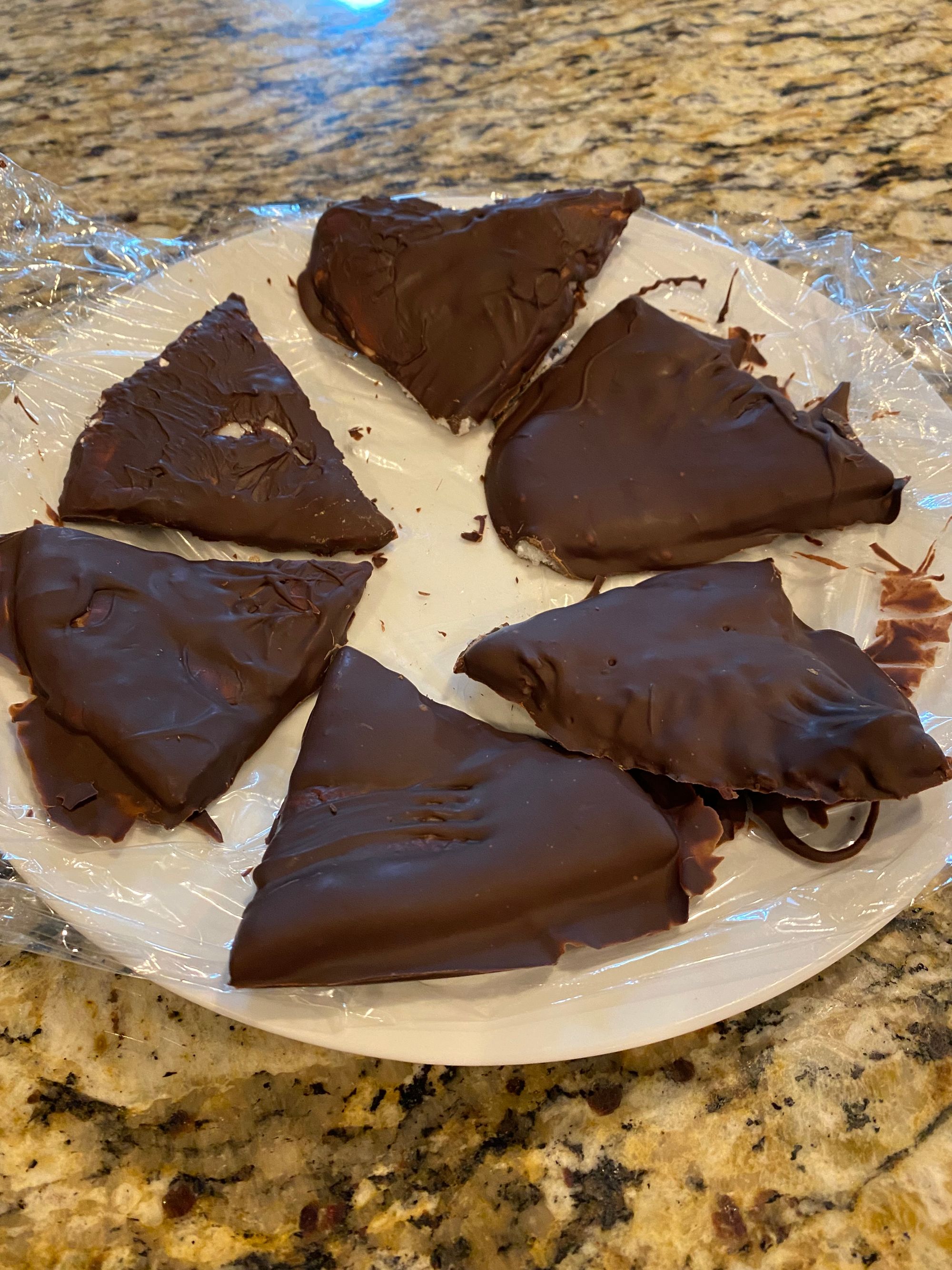 I didn't realize peppermint patties were so easy to put together. They also don't need to look perfect like York Peppermint Patties since they would be chopped up to be mixed into the ice cream. However, I made the mistake of not letting the peppermint "filling" firm up in the fridge before dipping in the chocolate. The warm chocolate deformed the filling, but I quickly corrected after the first one by putting the other wedges in the fridge for a little bit and that helped. Of course, munching a few when you are churning the ice cream is always a nice chef's treat!