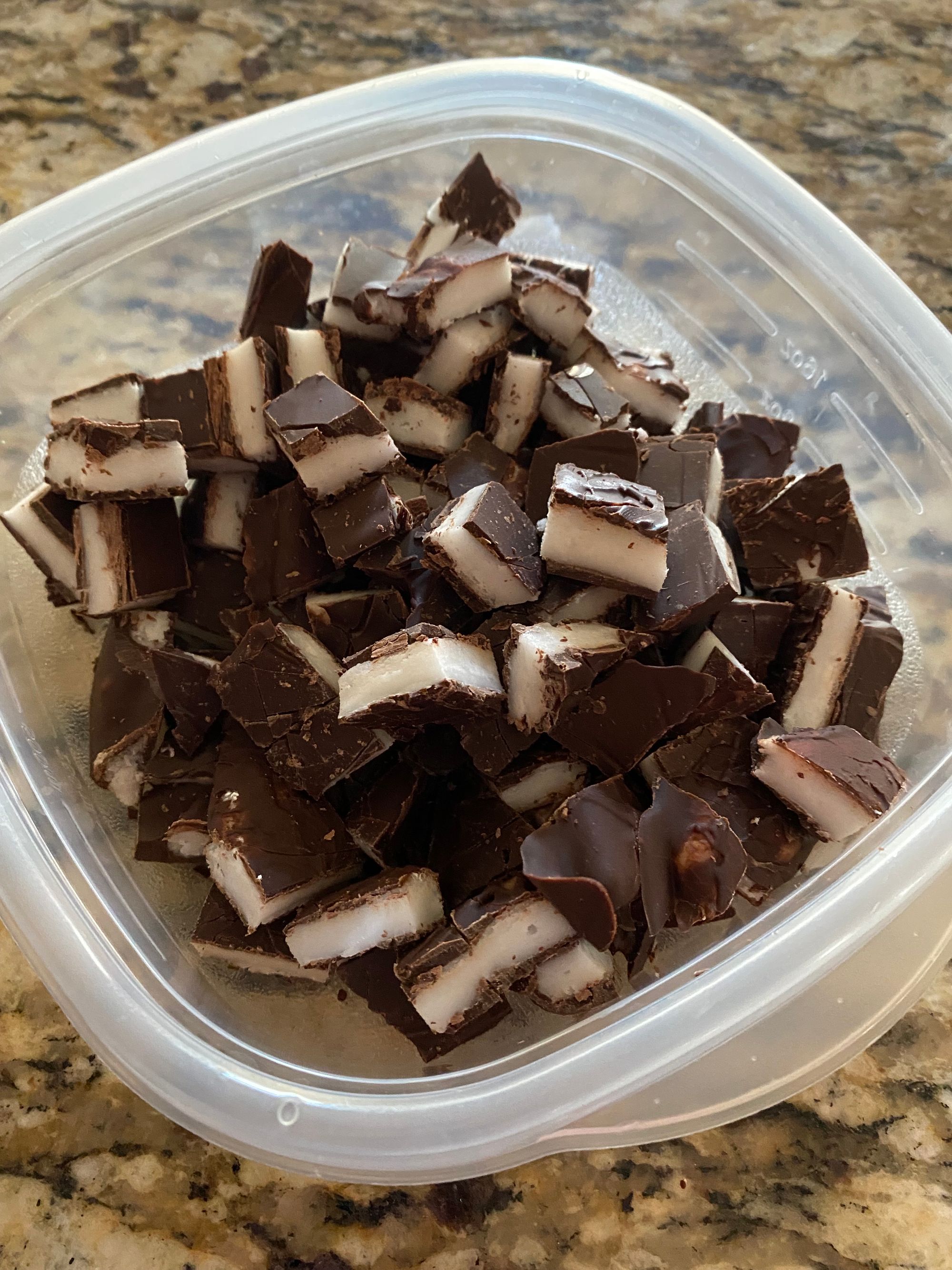 For this week's ice cream, I knew that I wanted to do a chocolate. I've made several types of chocolate ice creams over the years but they have all been consistently soft and melted quickly. It was time to make another batch to see if the softness problem could be solved. To accentuate the chocolate in this ice cream, I decided to add some homemade peppermint patties.