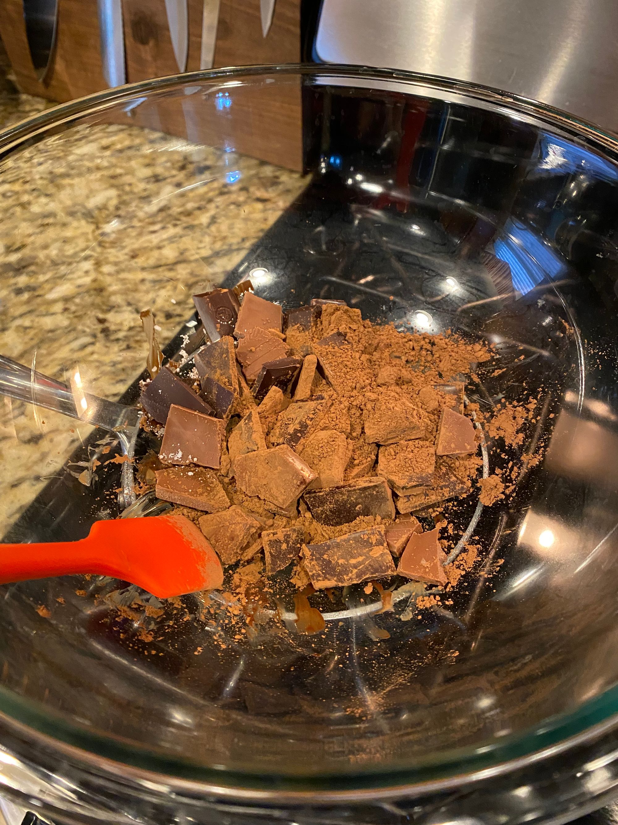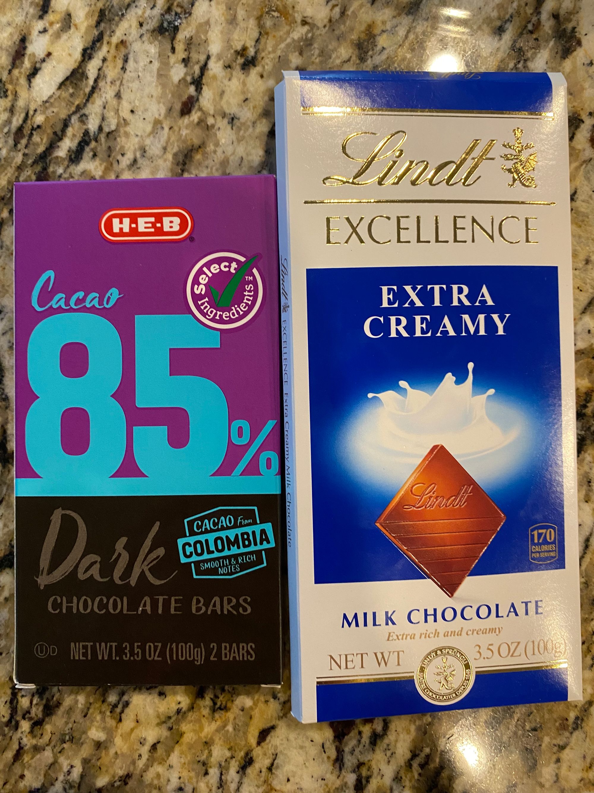 I hypothesized that my last batch of chocolate ice cream was soft due to an excess of sugar contributed by the chocolate. To test this out, I switched to 85% cacao for this batch. The higher the cacao percentage, the less room there is for fillers (mostly sugar). When I compared the sugar content of various cacao percentages, there was 15 g less sugar per serving of the 85% compared to the 70%!