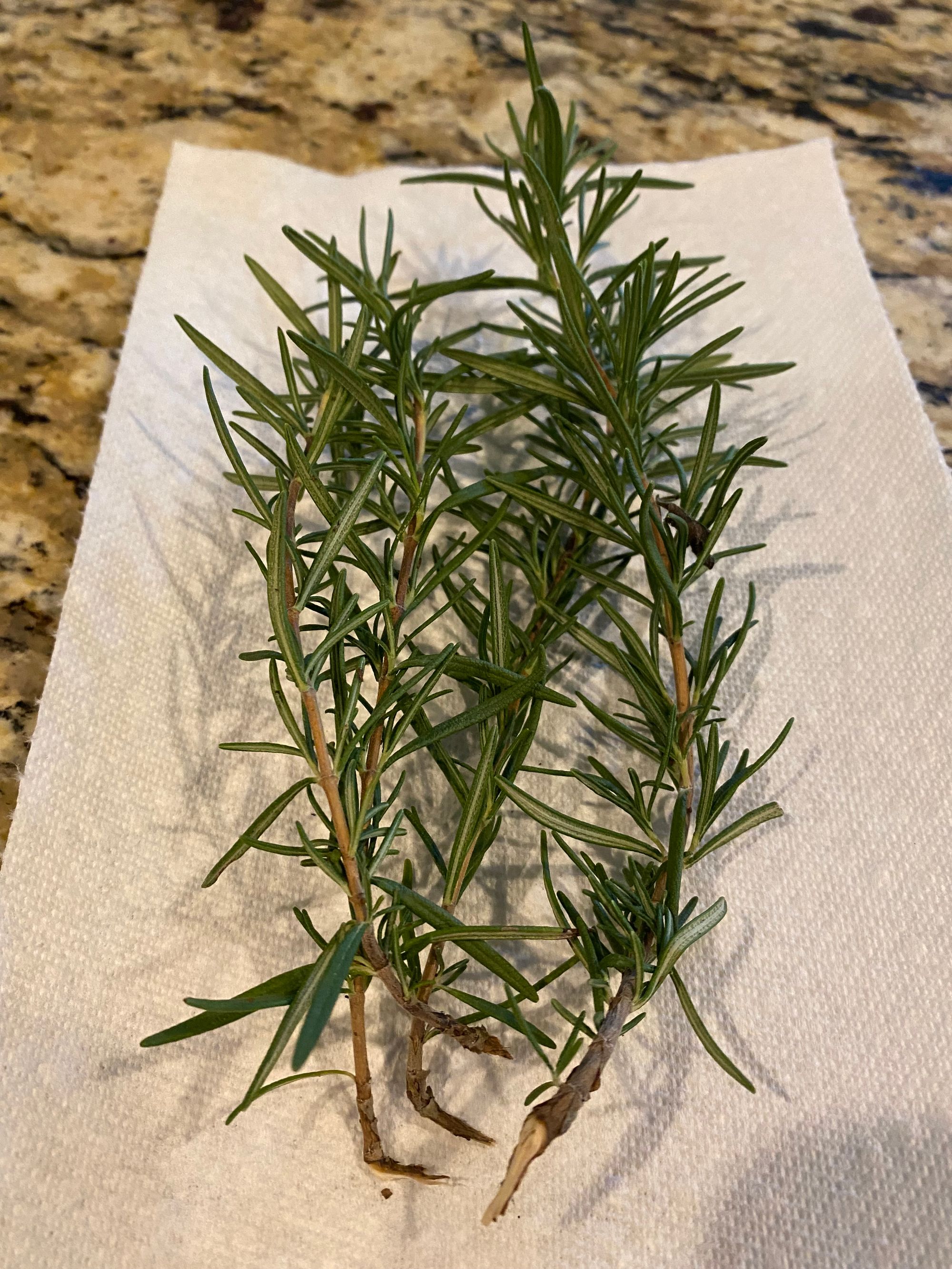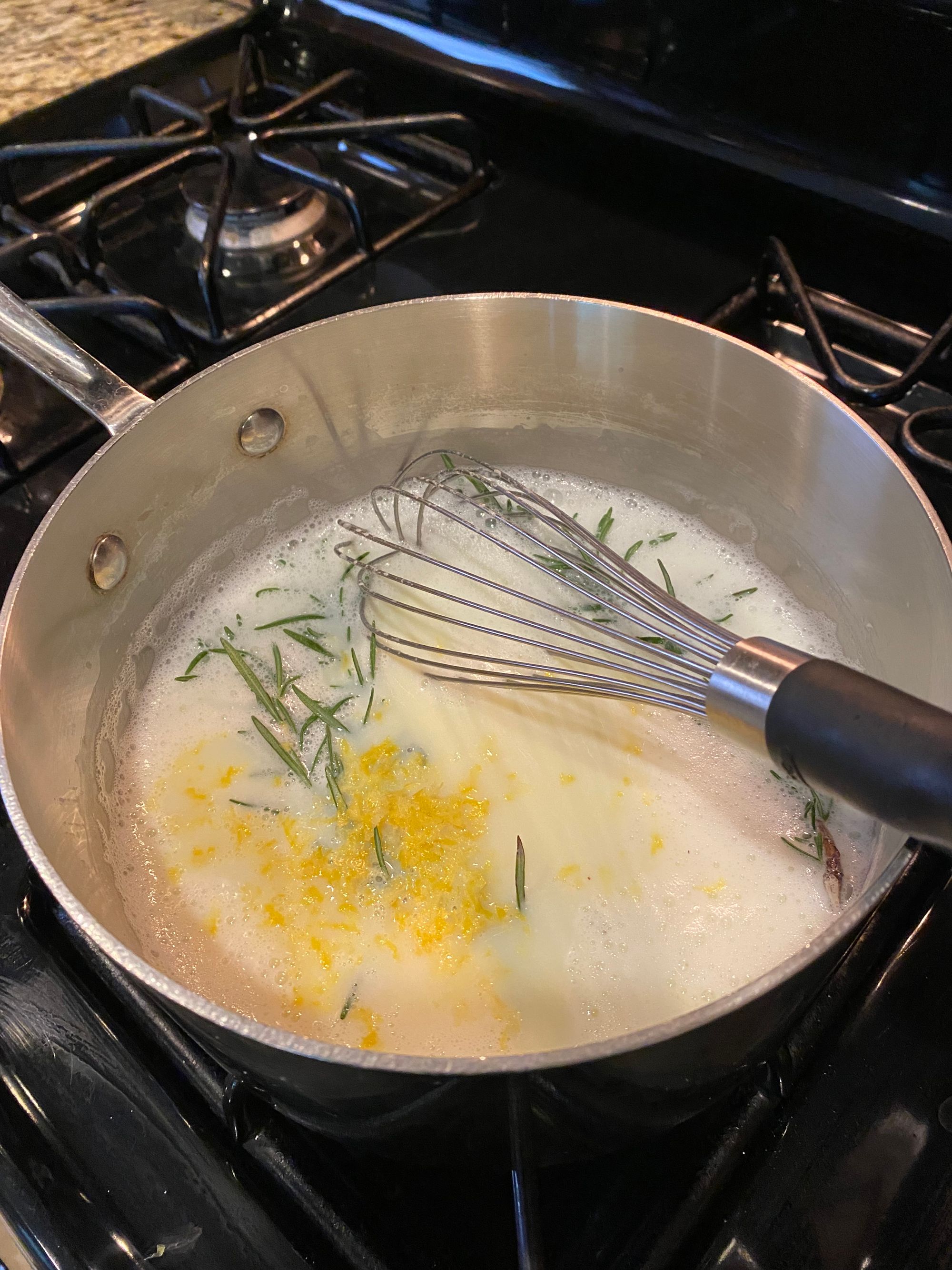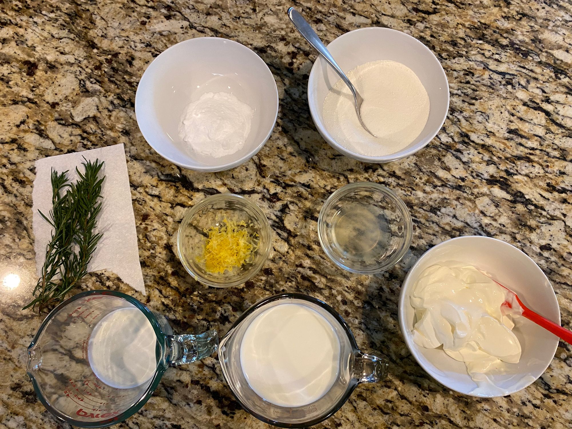 My batch of mint brownie ice cream did not last long enough (lots of sharing going on), so it was time to create something new. As I perused my (ever lengthening) list of ice cream ideas that people have given to me, I settled on a lemon rosemary. The savoriness of the rosemary seemed like a good combination with the tartness of lemon. Plus it helps that my new rosemary plant in the garden has been getting bigger so it needs to be used to keep it at a reasonable size and to not overtake the nearby herbs.