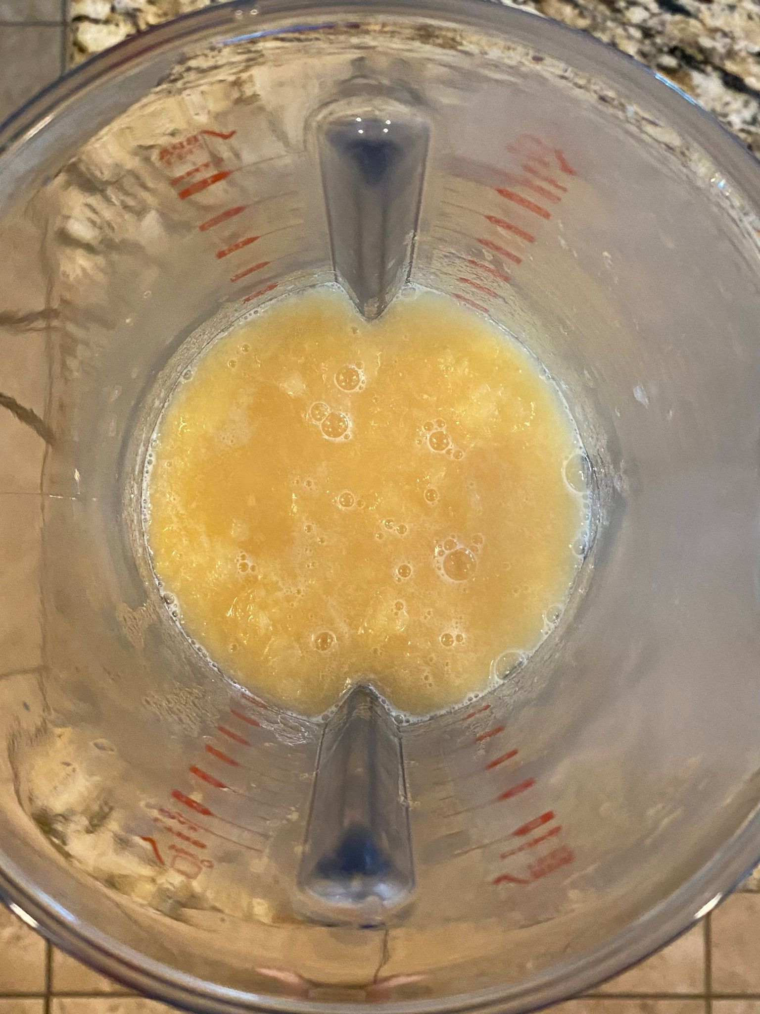 The recipe starts with making a peach puree. This involved removing the skins, cooking the flesh to release the juice, then blending to a puree. The peaches I had purchased were clingstone peaches, which made it difficult to get all the fruit off of the stone. I ended up having to cut the flesh off and squeezing off the remaining flesh. I didn't get any Fredericksburg peaches last year due to the pandemic, but I seem to recall those are freestone, which should make it easier to separate the flesh from the stone.