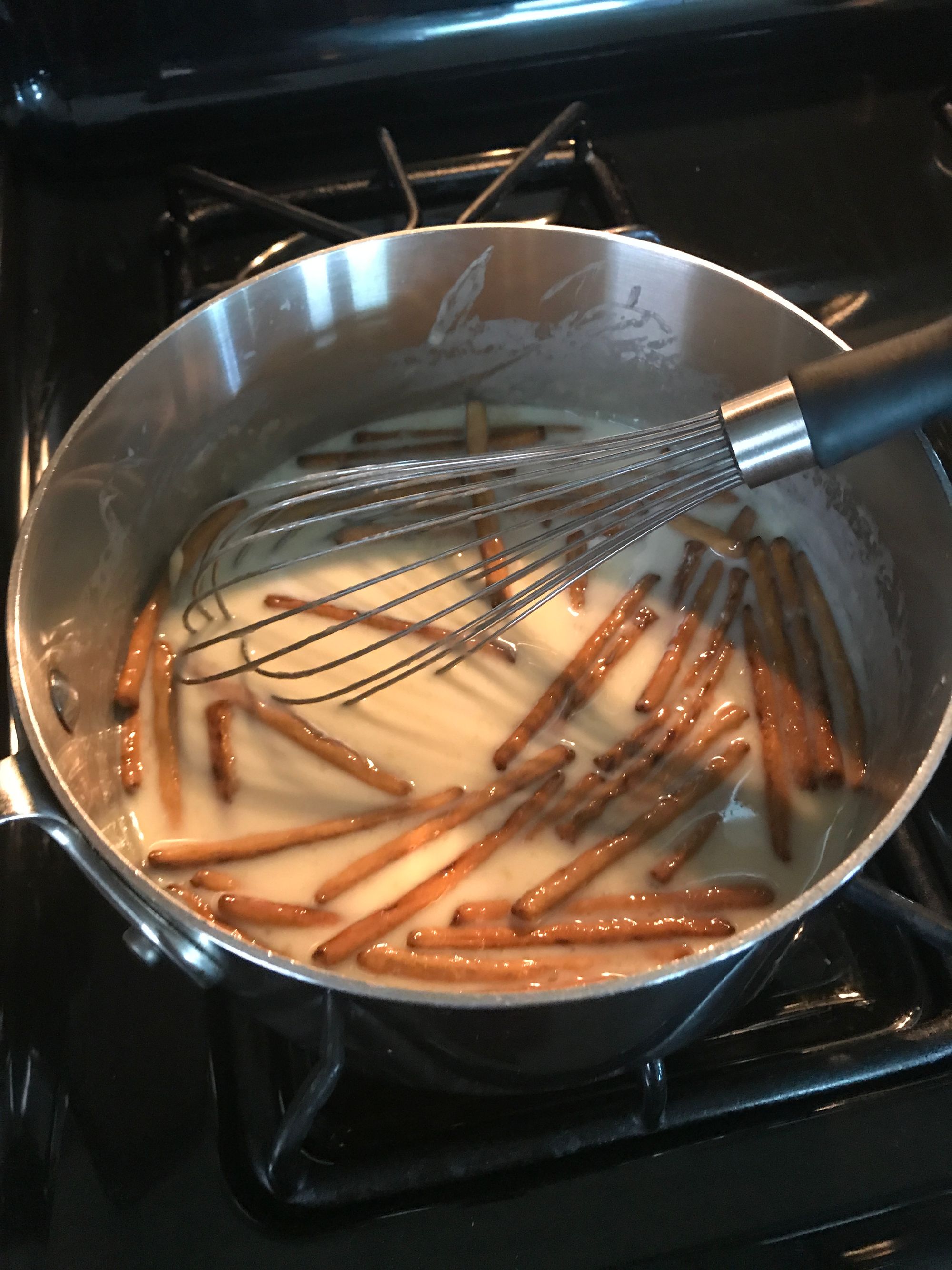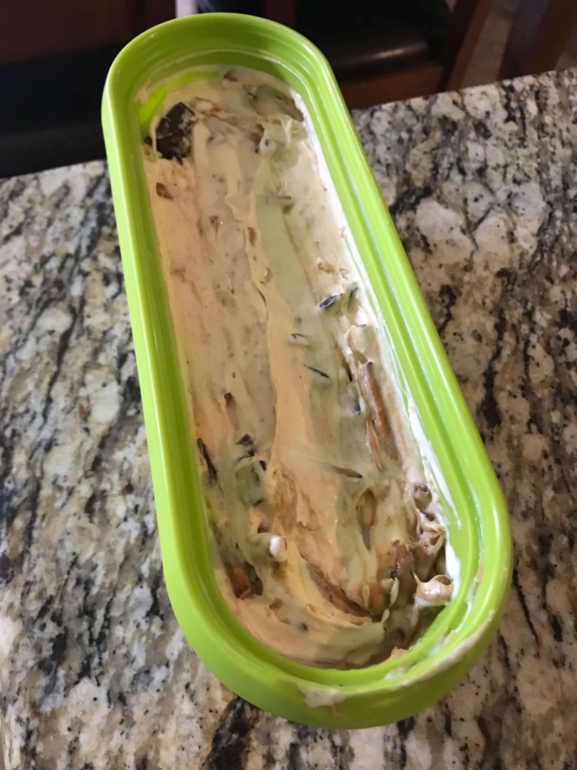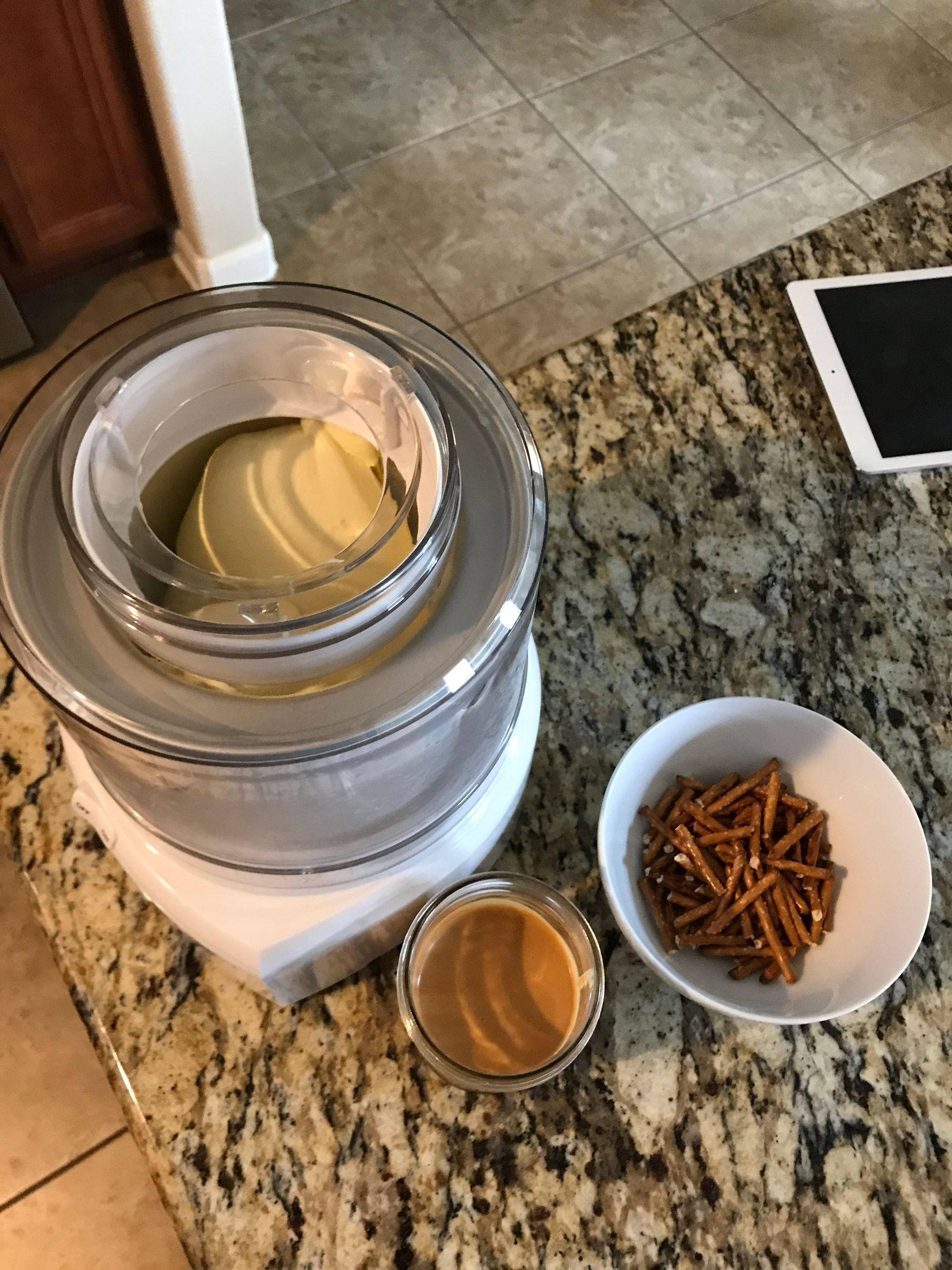 This ice cream consisted of a custard base with pretzel infused. From there, chocolate chunks and a peanut butter ripple were added.